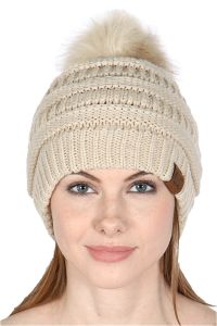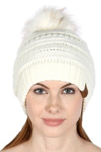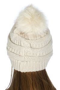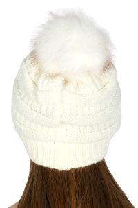 V00 C.C Classic Matching Fur Pom knit beanie Hat, Ivory