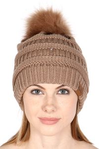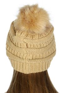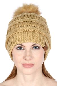 V00 C.C Classic Matching Fur Pom knit beanie Hat, Camel