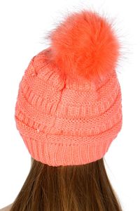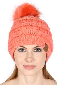 V00 C.C Classic Matching Fur Pom knit beanie Hat, Coral