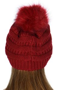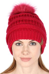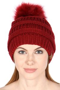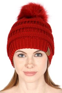 V00 C.C Classic Matching Fur Pom knit beanie Hat, Burgundy