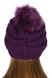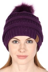 V00 C.C Classic Matching Fur Pom knit beanie Hat, Dark.Purple
