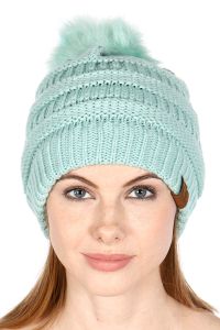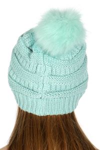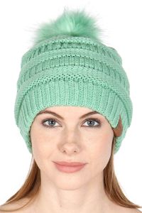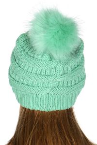 V00 C.C Classic Matching Fur Pom knit beanie Hat, Mint