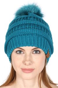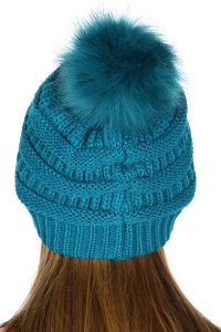 V00 C.C Classic Matching Fur Pom knit beanie Hat, Teal
