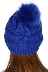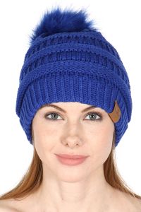 V00 C.C Classic Matching Fur Pom knit beanie Hat, Royal