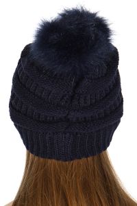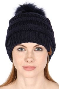 V00 C.C Classic Matching Fur Pom knit beanie Hat, Navy