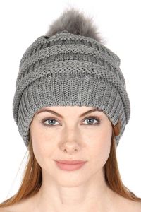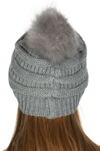 V00 C.C Classic Matching Fur Pom knit beanie Hat, Light.Melange.Grey