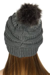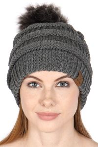 V00 C.C Classic Matching Fur Pom knit beanie Hat, Dark.Melange.Grey