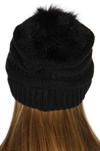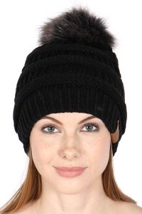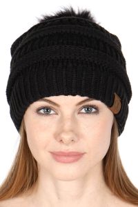 V00 C.C Classic Matching Fur Pom knit beanie Hat, Black