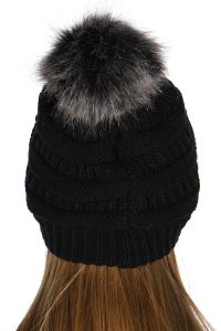 V00 C.C Classic Matching Fur Pom knit beanie Hat, Black.Grey