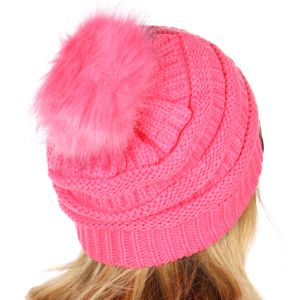 V00 C.C Classic Matching Fur Pom knit beanie Hat, Hot.Pink